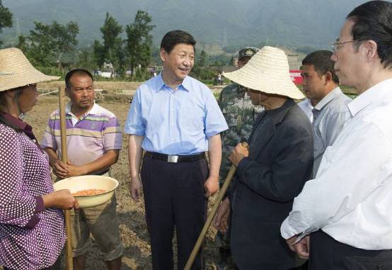 2013年5月21日,習(xí)近平在四川蘆山縣龍門鄉(xiāng)青龍場村的農(nóng)田同正在播種玉米的村民親切交流。 新華社記者黃敬文攝