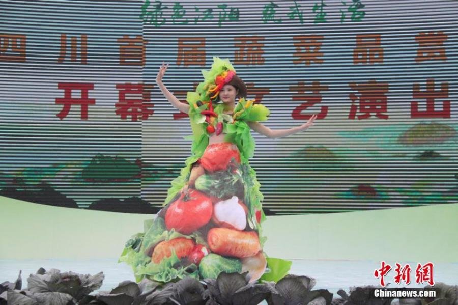 2016年4月28日,四川首屆蔬菜品賞會(huì)在瀘州市開幕。在活動(dòng)現(xiàn)場(chǎng),一眾模特?fù)Q上特殊的以蔬菜元素設(shè)計(jì)的服裝,秒變蔬菜姑娘。