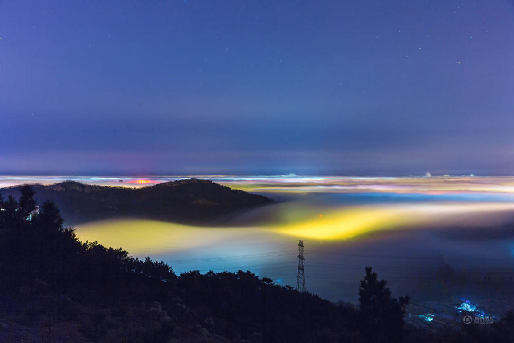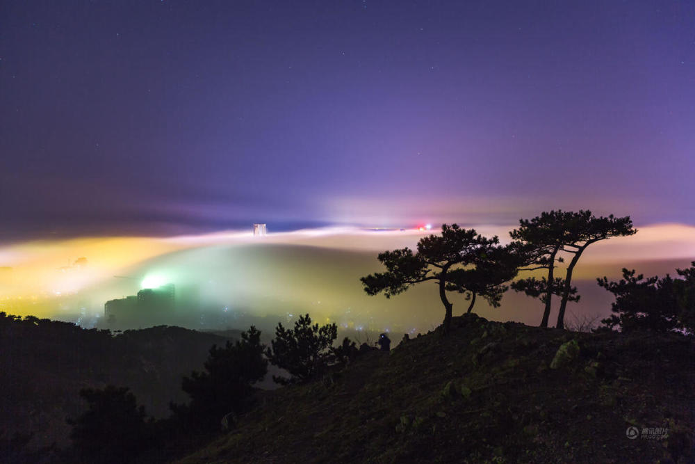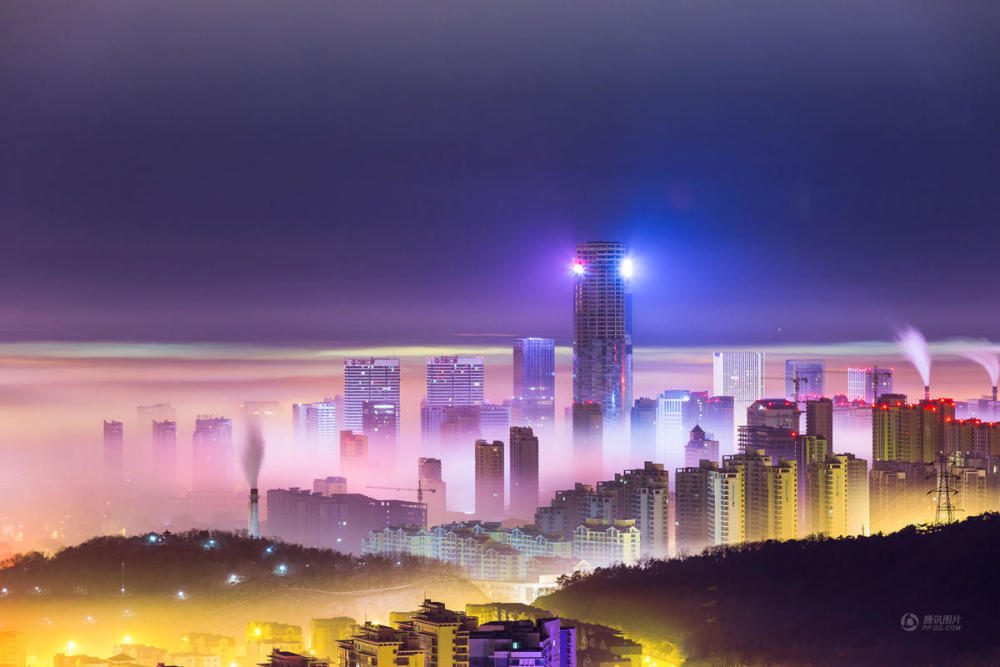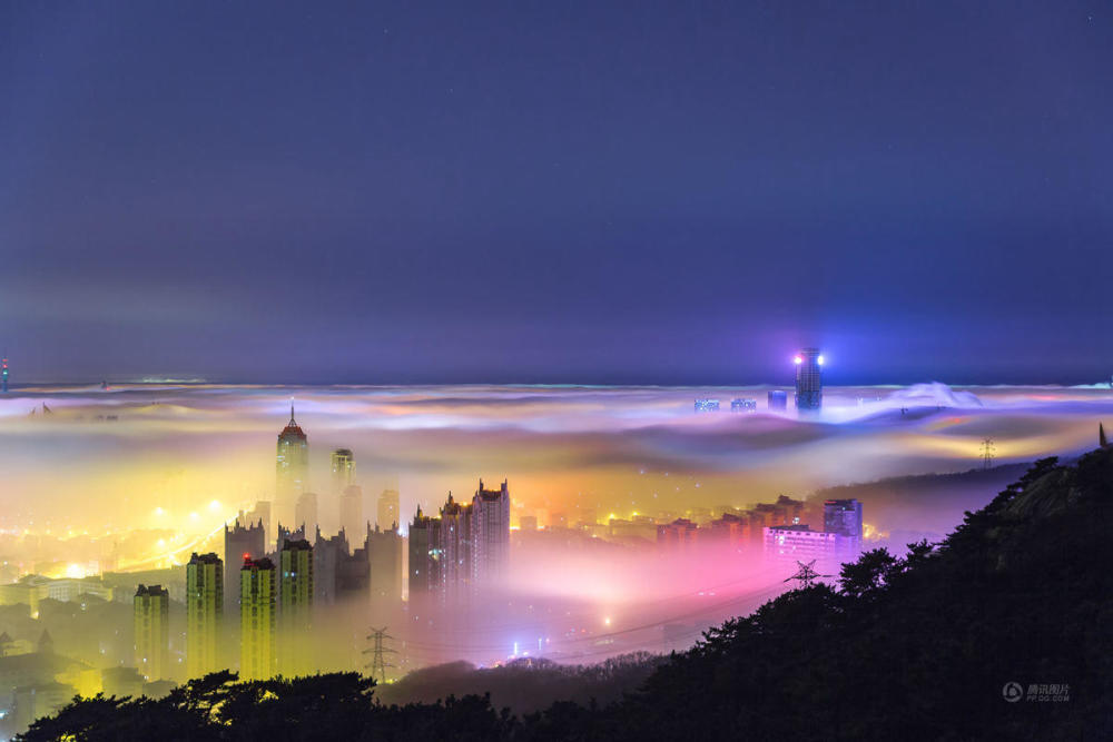 2017年1月2日夜晚,平流霧登臨青島。從山頂看青島,東部CBD附近的建筑在平流霧里時隱時現(xiàn),而霧氣在夜間燈光的輝映下,流光溢彩,宛若仙境。視覺中國