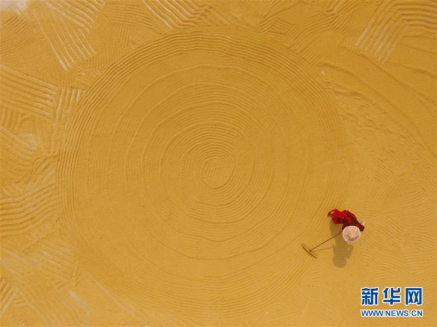 4月20日,海南瓊海博鰲鎮(zhèn)朝烈村的農(nóng)民在翻曬收獲的稻谷(無人機拍攝) 。 當(dāng)日是二十四節(jié)氣谷雨。 新華社發(fā)(蒙鐘德 攝)