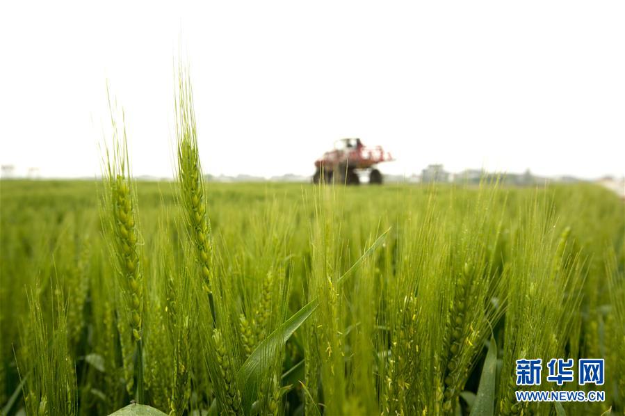 4月20日,在江蘇省海安農(nóng)場,農(nóng)民駕駛農(nóng)機在麥田管護。 當(dāng)日是二十四節(jié)氣谷雨。 新華社發(fā)(徐勁柏 攝)