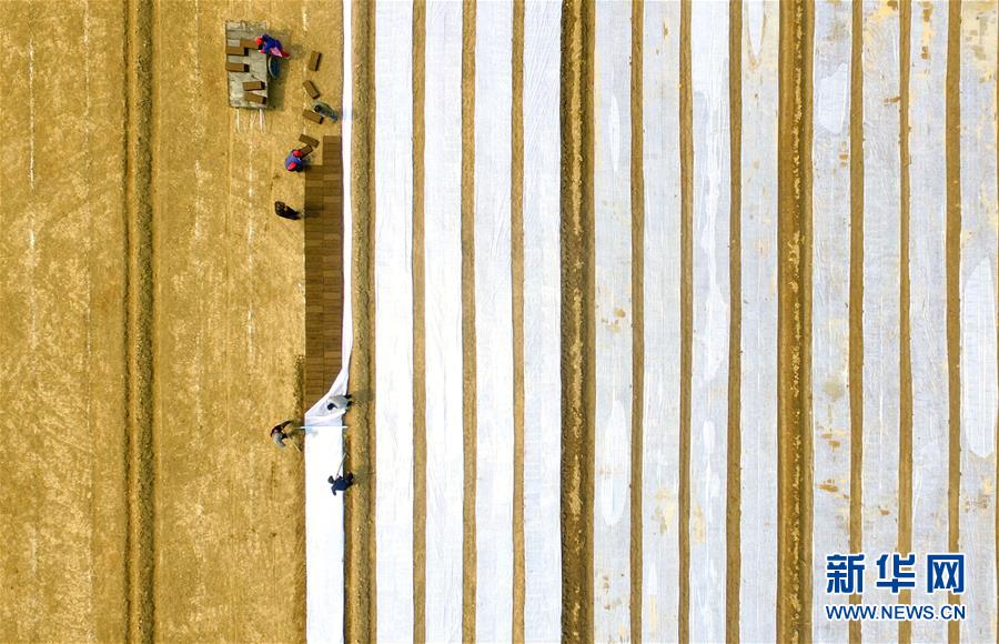 4月20日,山東省濱州市高新區(qū)一種植專業(yè)合作社的社員在田間勞作(無人機拍攝) 。 當(dāng)日是二十四節(jié)氣谷雨。 新華社發(fā)(張春峰 攝)