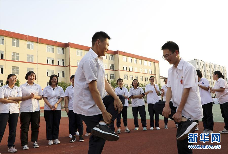 6月2日,在山東省濱州市博興縣第三中學(xué),高三學(xué)生在操場(chǎng)上做游戲放松心情。高考臨近,山東省濱州市博興縣第三中學(xué)組織高三學(xué)生參加趣味游戲,幫助學(xué)生放松心情,迎接高考。 新華社發(fā)(陳彬 攝)