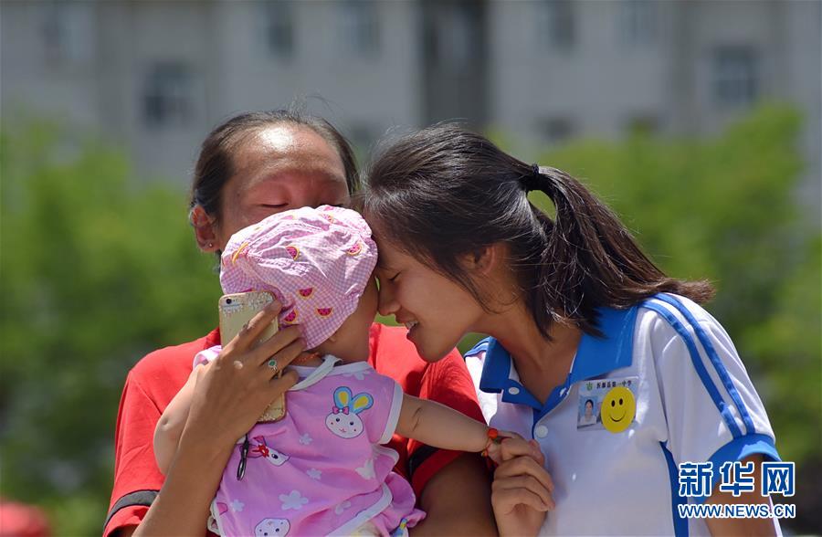6月7日,在安徽合肥市第八中學考點,送考老師(右)鼓勵即將進入考場的考生。 當日,2019年高考拉開帷幕。 新華社記者 張端 攝