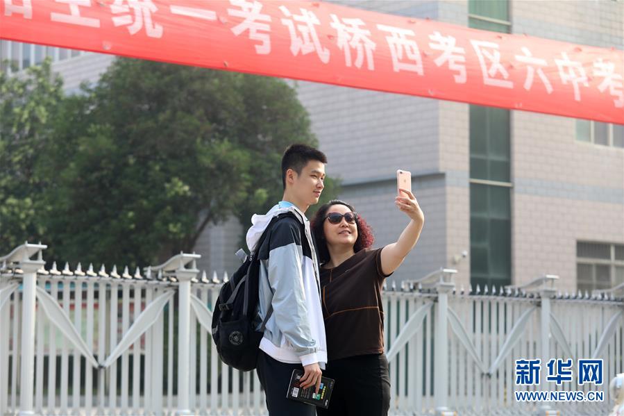 6月7日,在河北石家莊市第六中學高考考點,一名考生與家長合影留念。 當日,2019年高考拉開帷幕。 新華社發(fā)(梁子棟攝)