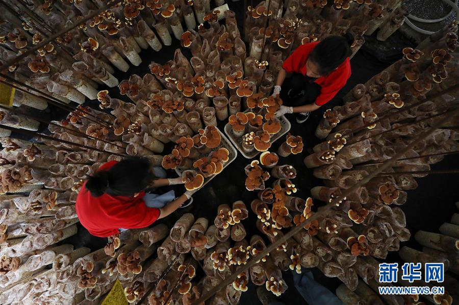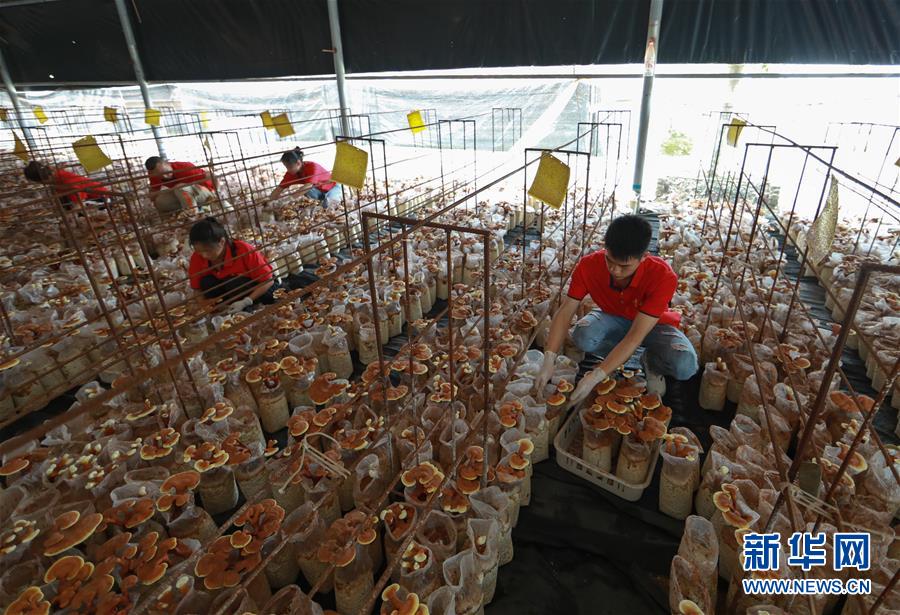 7月11日,在貴州省玉屏侗族自治縣貴福菌業(yè)靈芝培植大棚內(nèi),工人在采收靈芝。 新華社發(fā)(黃曉海 攝)