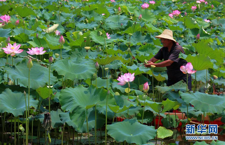 7月11日,農(nóng)戶在安徽安慶市宜秀區(qū)楊橋鎮(zhèn)鮑沖湖蓮花種植基地采摘蓮蓬。 新華社發(fā)(江勝 攝)