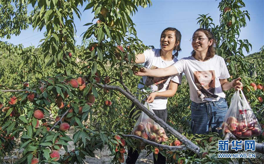 8月15日,游客在青陽(yáng)岔鎮(zhèn)高石崖村采摘園采摘桃子。新華社記者 陶明 攝 |