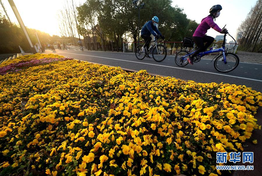 3月15日,游客在上海后灘濕地公園騎行。 新華社記者 陳飛 攝