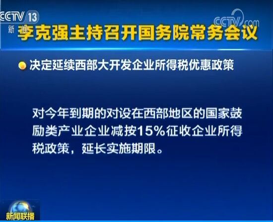 為深入推進西部大開發(fā)、穩(wěn)定企業(yè)長期發(fā)展預期,會議決定,對今年底到期的對設在西部地區(qū)的國家鼓勵類產業(yè)企業(yè)減按15%稅率征收企業(yè)所得稅政策,延長實施期限。同時,降低享受政策的門檻,將鼓勵類產業(yè)項目當年度主營業(yè)務收入占企業(yè)收入總額限制比例由70%降至60%。