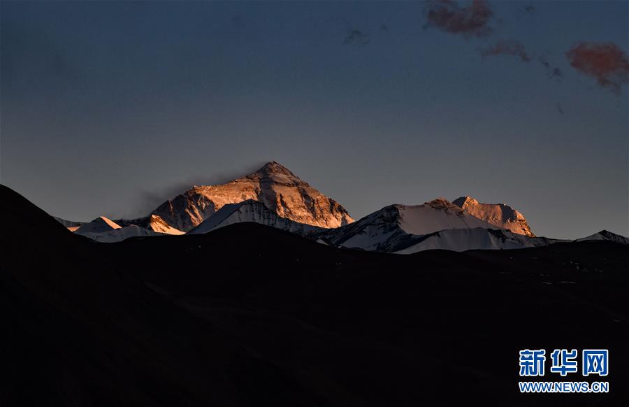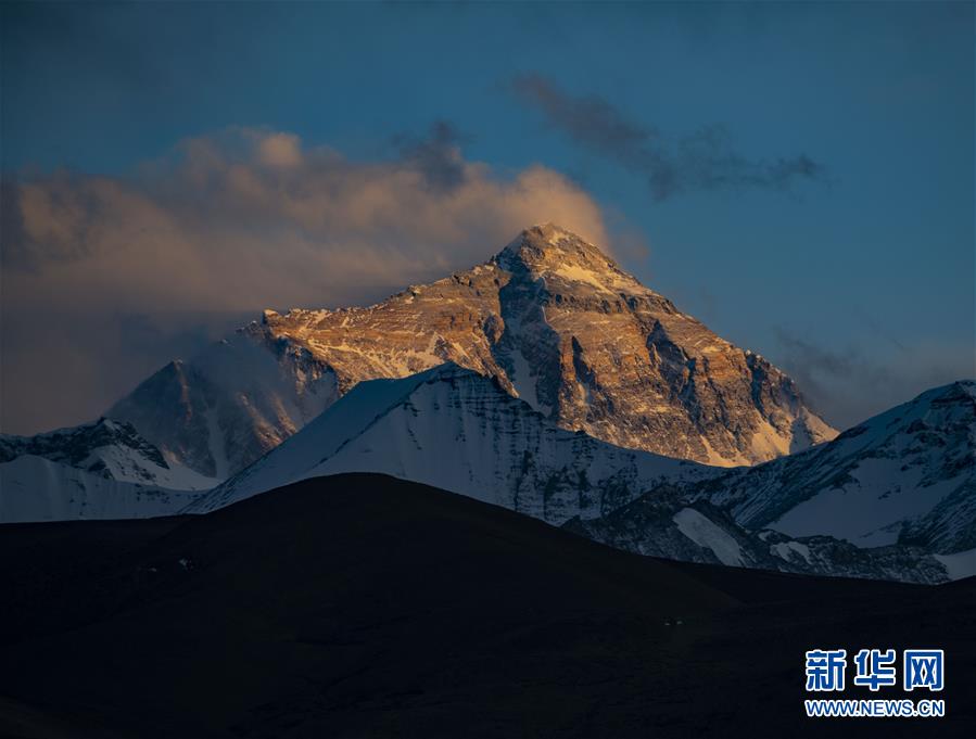 這是5月3日拍攝的夕陽下的珠峰。 世界第一高峰珠穆朗瑪峰終年積雪,頂峰云霧繚繞,美不勝收。 新華社記者 多吉占堆 攝