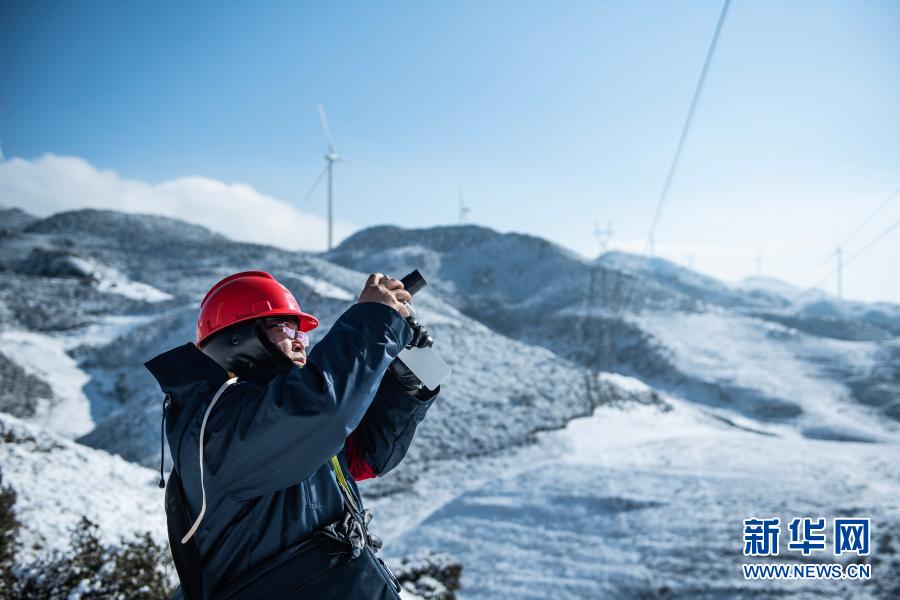 六盤水供電局輸電所巡檢2班工作人員在四格風(fēng)電場(chǎng)使用覆冰觀測(cè)儀檢查線路覆冰情況(1月12日攝)。
