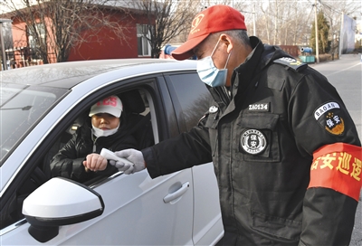 1月12日,通州區(qū)張家灣皇木廠村,村口有專人負責對進村的人員測量體溫。 新京報記者 吳寧 攝