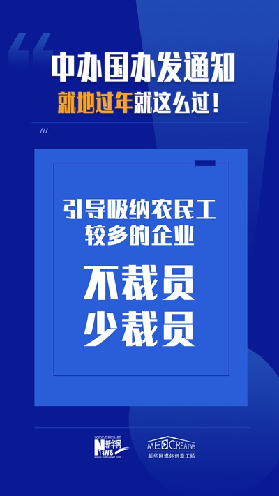 此次印發(fā)的通知明確:“指導(dǎo)企業(yè)穩(wěn)定就地過年群眾的勞動關(guān)系,規(guī)范用工行為,不得違法終止或解除勞動合同。在春節(jié)期間安排職工工作的,用人單位要依法支付加班工資!睘榇蠹覔(dān)心的“就地過年還是就地加班”等問題吃下“定心丸”。