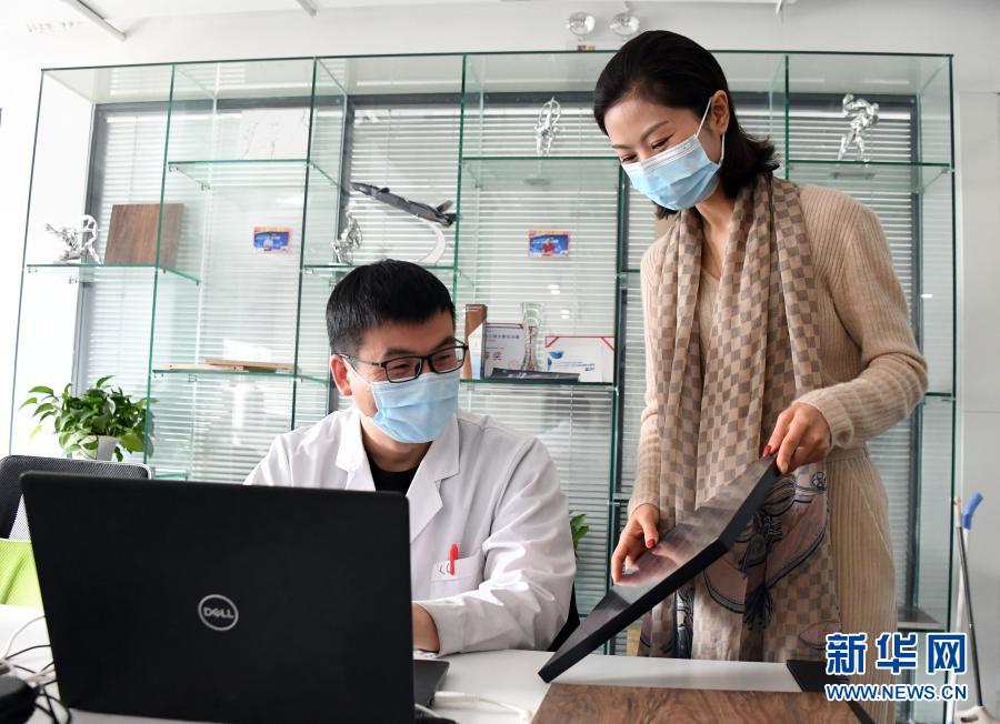 光之科技(北京)有限公司副總經(jīng)理?xiàng)蠲簦ㄓ遥┡c員工交流(2月18日攝)。新華社記者 任超 攝