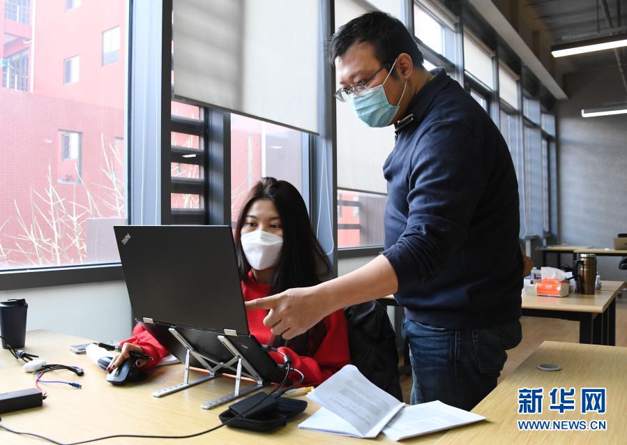 北京靈致芯科技有限公司CEO冉陽(右)與員工張伊祎交流(2月18日攝)。新華社記者 任超 攝