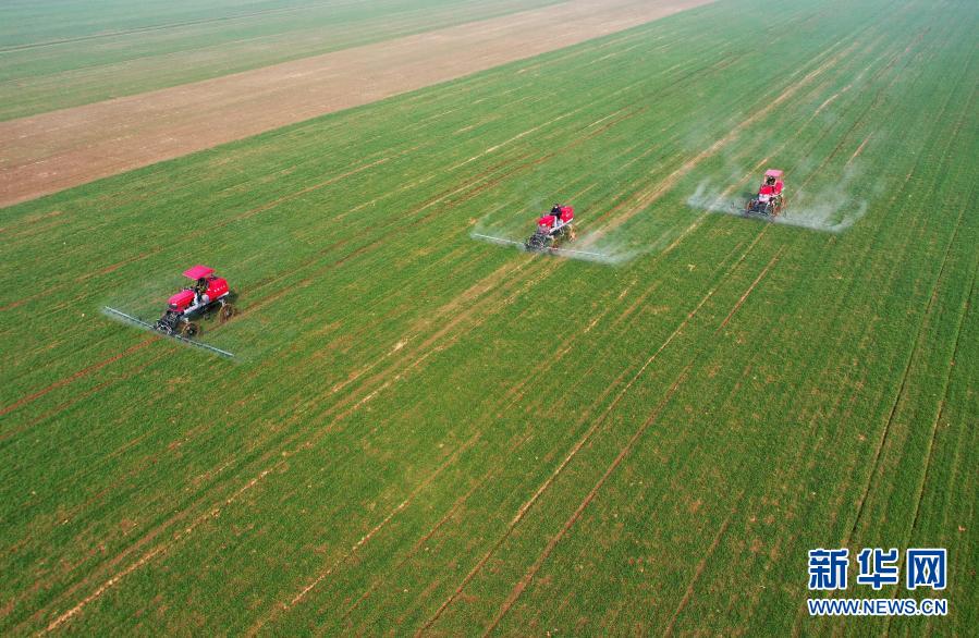 3月5日,河北省邢臺(tái)市南和區(qū)閻里鄉(xiāng)閻里村農(nóng)民操作農(nóng)業(yè)機(jī)械在麥田噴灑農(nóng)藥(無(wú)人機(jī)照片)。