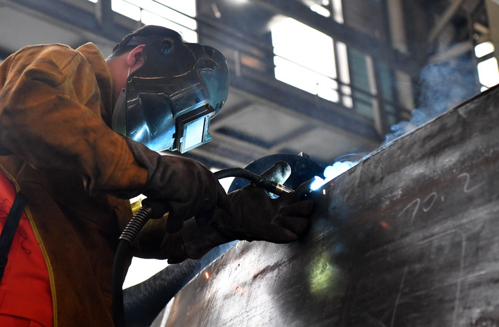 王安永在中鐵工程裝備集團有限公司的車間進行焊接作業(yè)。新華社記者李嘉南攝