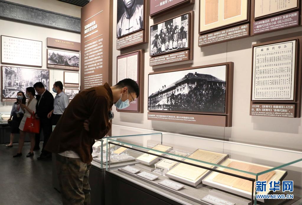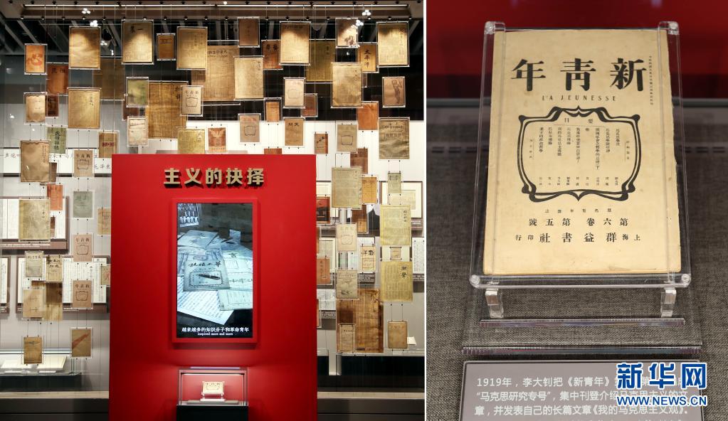 大型立體式視覺(jué)置景名為“主義的抉擇”,100件五四運(yùn)動(dòng)前后傳播馬克思主義、社會(huì)主義的報(bào)紙雜志,錯(cuò)落陳列在玻璃墻上。其中,《新青年》第6卷第5號(hào)“馬克思研究專號(hào)”在前端“高光”展示,這期“專號(hào)”標(biāo)志著馬克思主義在中國(guó)的傳播進(jìn)入了較為系統(tǒng)的階段(6月1日攝)。新華社記者 劉穎 攝