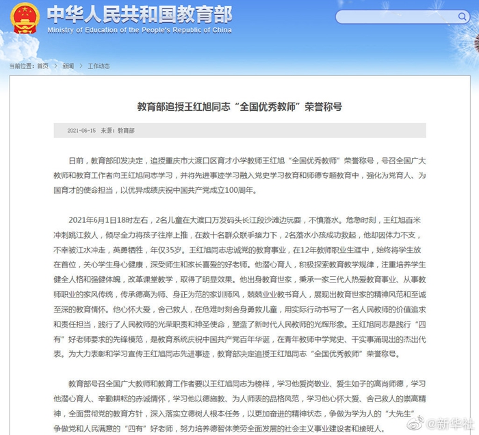 教育部日前印發(fā)決定,追授重慶市大渡口區(qū)育才小學(xué)教師王紅旭“全國優(yōu)秀教師”榮譽稱號。2021年6月1日18時左右,2名兒童在大渡口萬發(fā)碼頭長江段沙灘邊玩耍,不慎落水。危急時刻,王紅旭百米沖刺跳江救人,傾盡全力將孩子往岸上推,在數(shù)十名群眾聯(lián)手接力下,2名落水小孩成功救起,他卻因體力不支,不幸被江水沖走,英勇犧牲,年僅35歲。教育部號召全國廣大教師和教育工作者向王紅旭同志學(xué)習(xí),并將先進(jìn)事跡學(xué)習(xí)融入黨史學(xué)習(xí)教育和師德專題教育中,強化為黨育人、為國育才的使命擔(dān)當(dāng)。(記者王鵬)