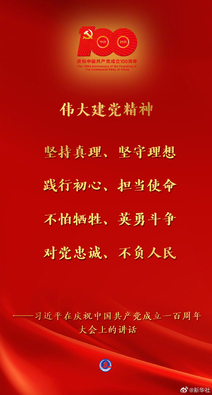 習近平說,一百年前,中國共產(chǎn)黨的先驅們創(chuàng)建了中國共產(chǎn)黨,形成了堅持真理、堅守理想,踐行初心、擔當使命,不怕犧牲、英勇斗爭,對黨忠誠、不負人民的偉大建黨精神,這是中國共產(chǎn)黨的精神之源。