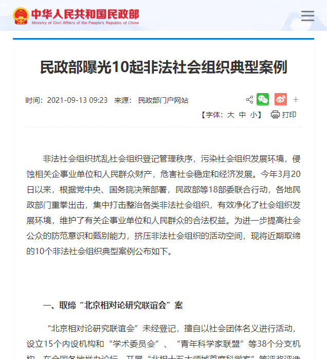 “北京相對論研究聯(lián)誼會”未經(jīng)登記,擅自以社會團體名義進行活動,設立15個內(nèi)設機構和“學術委員會”、“青年科學家聯(lián)盟”等38個分支機構,在全國各地舉辦論壇,開展“北相十五大領域首席科學家”等評獎評選活動,并組織制造所謂“永動機”、“蟲洞輸通機”、“意念照相機”、“心靈感應機”等設備。該非法社會組織與境外組織共同出版多份刊物,圍繞反相對論等偽科學研究,發(fā)表違背科學常識的“研究成果”,其中“熟雞蛋返生”事件引發(fā)網(wǎng)絡熱議。2021年6月,北京市民政局依法對“北京相對論研究聯(lián)誼會”及其分支機構予以取締。