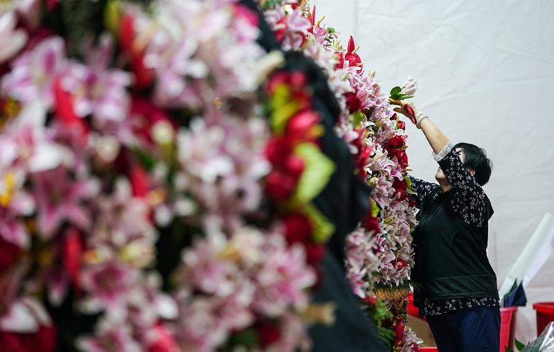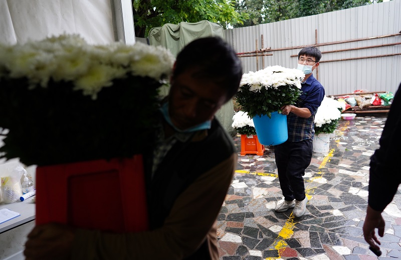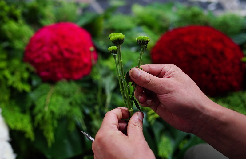 △用于慶典的白菊花自云南產(chǎn)地空運(yùn)抵京,精挑細(xì)選后將被制成花臺(tái)。