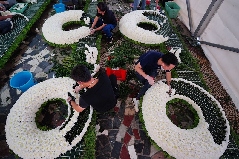 △花藝師們?cè)诨ㄅ_(tái)基座旁忙碌,一座座潔白的菊花臺(tái)已顯露雛形。