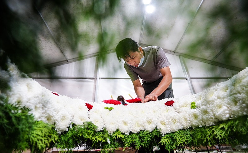 △花藝師為花臺(tái)做最后的修整加工。萬(wàn)余朵新鮮白菊花扎制成的六座花臺(tái),要保證每一處線條與弧度整齊劃一,這需要花藝師有豐富的經(jīng)驗(yàn)。