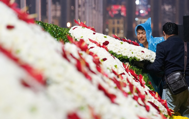 △制作完成的花臺(tái)等待裝運(yùn),送往儀式舉辦地——天安門(mén)廣場(chǎng)。