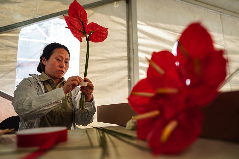 △工作人員對(duì)花籃進(jìn)行修整,力求形態(tài)完美。