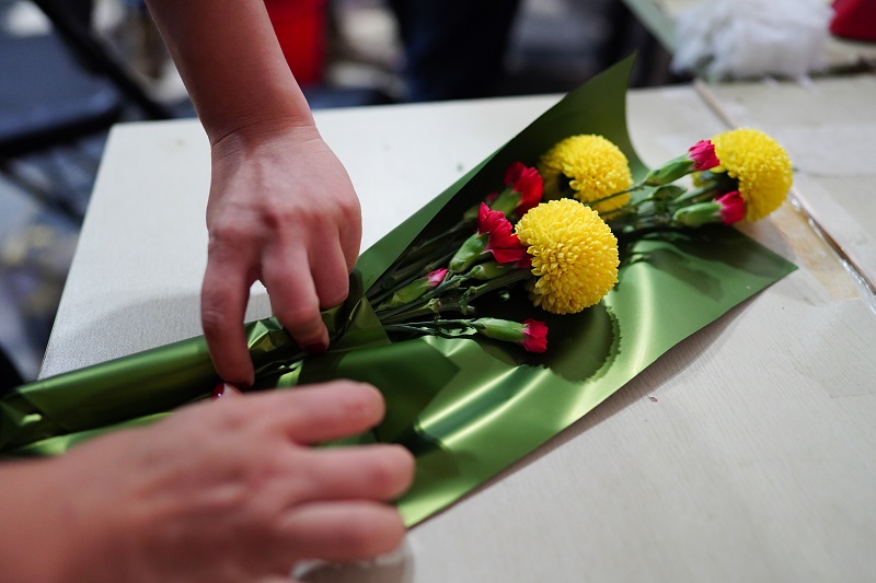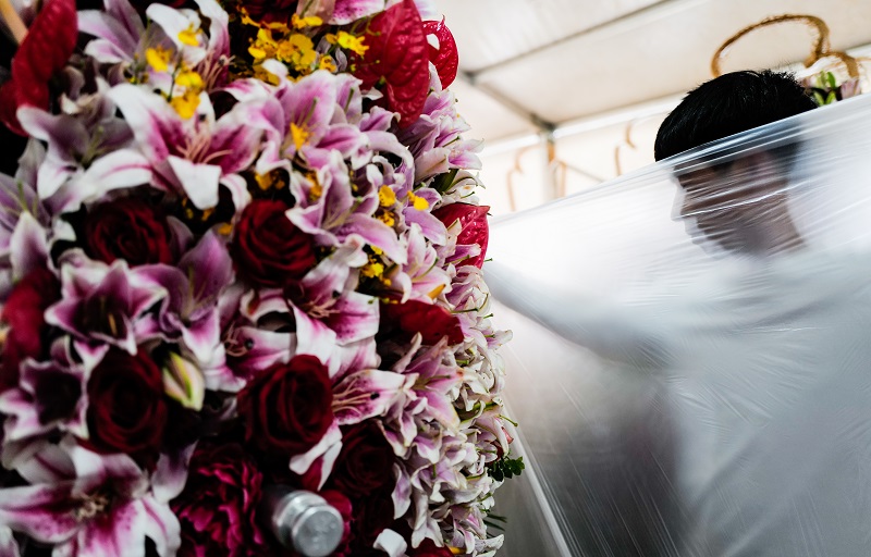 △花藝師為花籃覆蓋薄膜保鮮,以保持鮮花的最佳狀態(tài)。