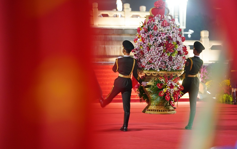 △烈士紀(jì)念日向人民英雄敬獻(xiàn)花籃儀式演練現(xiàn)場(chǎng),滿含制作人員心血與敬意的花籃以完美形態(tài)呈現(xiàn),步步留香,致敬英烈。