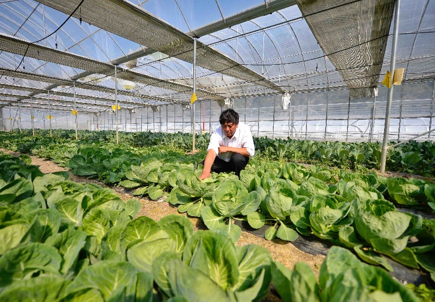 10月25日,村民在位于西地村的生態(tài)農(nóng)業(yè)示范基地內(nèi)查看蔬菜生長情況。新華社記者 劉坤 攝