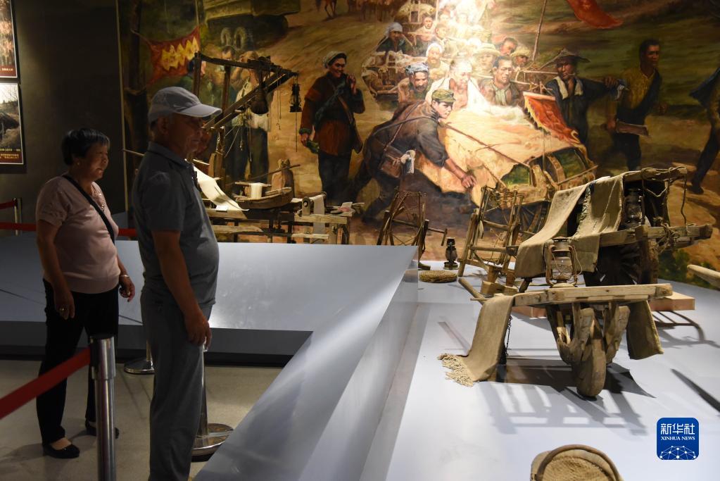 在位于山東省臨沂市蒙陰縣的孟良崮戰(zhàn)役紀(jì)念館,游客參觀孟良崮戰(zhàn)役期間使用過(guò)的小推車(chē)(2019年6月9日攝)。新華社記者 王凱 攝