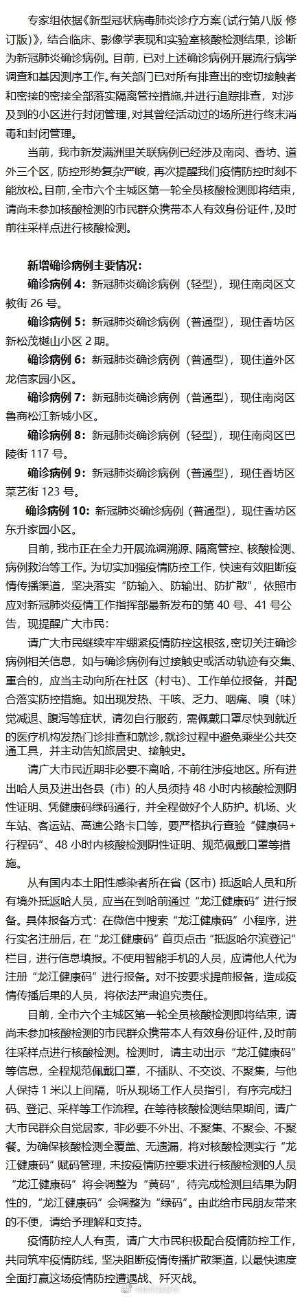 12月3日下午,哈爾濱市人民政府新聞辦公室舉行疫情防控工作第四十場(chǎng)新聞發(fā)布會(huì),市衛(wèi)健委黨委書(shū)記柯云楠通報(bào)我市疫情防控最新情況。12月2日14-24時(shí),哈爾濱市新增滿洲里關(guān)聯(lián)本土新冠肺炎確診病例7例,其中南崗區(qū)3例,香坊區(qū)3例,道外區(qū)1例,全部為滿洲里確診病例在哈的密切接觸者,均在集中隔離觀察期間發(fā)現(xiàn),已閉環(huán)轉(zhuǎn)運(yùn)至市第六醫(yī)院進(jìn)行隔離治療。