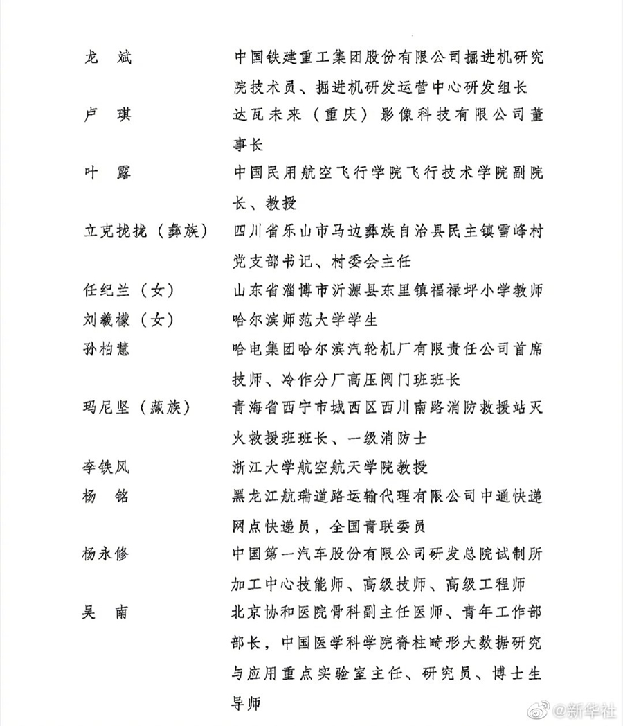 榮獲第26屆“中國青年五四獎章”的分別是:蘇州系統(tǒng)醫(yī)學研究所所長助理、免疫平臺主任、研究員、博士生導師馬瑜婷(女),西北工業(yè)大學網絡空間安全學院黨總支書記王震,華中科技大學同濟醫(yī)學院附屬協和醫(yī)院檢驗科主任、再生醫(yī)學中心主任王琳(女),國網北京市電力公司營銷部副主任王瓊(女),中國鐵建鐵一院地質路基設計院地質一所高級工程師、川藏鐵路地質專業(yè)負責人王杜江,山東省濟南萊蕪高莊法律服務所黨支部書記、主任王其欣,中國郵政航空有限責任公司B737一中隊隊長、二級飛行員王曉輝,玉鋒實業(yè)集團有限公司黨委副書記、總裁王康偉,廣州九尾信息科技有限公司黨支部書記、董事長王銳旭,中國鐵建重工集團股份有限公司掘進機研究院技術員、掘進機研發(fā)運營中心研發(fā)組長龍斌,達瓦未來(重慶)影像科技有限公司董事長盧琪,中國民用航空飛行學院飛行技術學院副院長、教授葉露,四川省樂山市馬邊彝族自治縣民主鎮(zhèn)雪峰村黨支部書記、村委會主任立克攏攏(彝族),山東省淄博市沂源縣東里鎮(zhèn)福祿坪小學教師任紀蘭(女),哈爾濱師范大學學生劉羲檬(女),哈電集團哈爾濱汽輪機廠有限責任公司首席技師、冷作分廠高壓閥門班班長孫柏慧,青海省西寧市城西區(qū)西川南路消防救援站滅火救援班班長、一級消防士瑪尼堅(藏族),浙江大學航空航天學院教授李鐵風,黑龍江航瑞道路運輸代理有限公司中通快遞網點快遞員楊銘,中國第一汽車股份有限公司研發(fā)總院試制所加工中心技能師、高級技師、高級工程師楊永修,北京協和醫(yī)院骨科副主任醫(yī)師、青年工作部部長吳南,海南省白沙黎族自治縣阜龍鄉(xiāng)黨委組織委員邱瑞麟(黎族),云南省昆明市公安局特種警察支隊五大隊黨總支書記、大隊長鄒路遙(傣族),交通運輸部東海第一救助飛行隊搜救教員機長、飛行管理部部長宋寅(女),新疆阿勒泰地區(qū)自然保護協會會長初雯雯(女),中國石油天然氣集團有限公司遼河油田分公司電焊工張亮,湖北順豐速運有限公司唐家墩營業(yè)點收派員張裕,北京市公安局通州分局警務支援支隊視頻警務中隊中隊長張旗,天津榮程聯合鋼鐵集團有限公司董事長張君婷(女),中國航天科工集團航天三江17所總師助理、高級工程師陳際瑋,寧夏灝瀚生物科技產業(yè)有限公司總經理陳曉燕(女),湖北省農業(yè)科學院糧食作物研究所水稻雜種優(yōu)勢利用研究室主任、研究員周雷,中國人民解放軍96712部隊71分隊二級軍士長侯長嶺,中國人民解放軍66011部隊40分隊分隊長侯國領,中鐵十二局集團川藏鐵路CZSCZQ-5標段五工區(qū)項目部負責人姜文濤(蒙古族),牧原實業(yè)集團有限公司副總裁秦牧原,西藏地球第三極產業(yè)發(fā)展有限公司董事長格勒巴桑(藏族),江西省萍鄉(xiāng)市特殊教育學校教師賈君婷仙(女),中國科學院空天信息創(chuàng)新研究院研究員、博士生導師徐穎(女),中國人民解放軍63610部隊某室高級工程師唐學海,河鋼集團邯鋼公司邯寶煉鋼廠特檔技術主管、轉爐車間副主任唐笑宇(滿族),蘇州蛟視智能科技有限公司董事長、總經理、正高級工程師黃帆,中國航天科技集團有限公司第五研究院總體設計部型號副總設計師黃震,上海交通大學電子信息與電氣工程學院黨委副書記、副教授、博士生導師黃文燾,南京大學電子科學與工程學院通信工程系主任、教授、博士生導師曹汛,航空工業(yè)成都飛機工業(yè)(集團)有限責任公司副總經理、研究員級高級工程師隋少春,廣州市花都區(qū)花東鎮(zhèn)七星小學副校長賴宣治,江西省九江學院團委辦公室主任、九江市武寧縣官蓮鄉(xiāng)東山村駐村第一書記譚翊泉,南京航空航天大學電子信息工程學院常務副院長、教授、博士生導師潘時龍,中國航天科技集團有限公司第一研究院一部副主任設計師馮韶偉,中國航天科技集團有限公司第八研究院五〇九所火星環(huán)繞器總體主任設計師?∑,中國射擊運動員楊倩(女),中國舉重運動員侯志慧(女),中國擊劍運動員孫一文(女),中國跳水運動員王涵(女),中國舉重運動員李發(fā)彬,中國舉重運動員諶利軍,中國射擊運動員姜冉馨(女),中國跳水運動員陳芋汐(女),中國跳水運動員張家齊(女),中國射擊運動員楊皓然(滿族),中國賽艇運動員陳云霞(女),中國賽艇運動員張靈(女),中國賽艇運動員呂揚(女),中國賽艇運動員崔曉桐(女),中國跳水運動員王宗源,中國跳水運動員謝思埸,中國游泳運動員張雨霏(女),中國游泳運動員楊,u(女),中國游泳運動員湯慕涵(女),中國游泳運動員李冰潔(女),中國乒乓球運動員陳夢(女),中國游泳運動員汪順,中國蹦床運動員朱雪瑩(女),中國羽毛球運動員王懿律,中國羽毛球運動員黃東萍(女),中國帆船運動員盧云秀(女),中國田徑運動員鞏立姣(女),中國羽毛球運動員陳雨菲(女),中國舉重運動員汪周雨(女),中國體操運動員劉洋,中國射擊運動員張常鴻,中國場地自行車運動員鮑珊菊(女),中國舉重運動員李雯雯(女,滿族),中國體操運動員鄒敬園,中國體操運動員管晨辰(女),中國跳水運動員全紅嬋(女),中國田徑運動員劉詩穎(女),中國皮劃艇靜水運動員徐詩曉(女),中國皮劃艇靜水運動員孫夢雅(女),中國輪椅擊劍運動員李豪,中國輪椅擊劍運動員邊靜(女),中國輪椅擊劍運動員譚淑梅(女),中國舉重運動員郭玲玲(女)