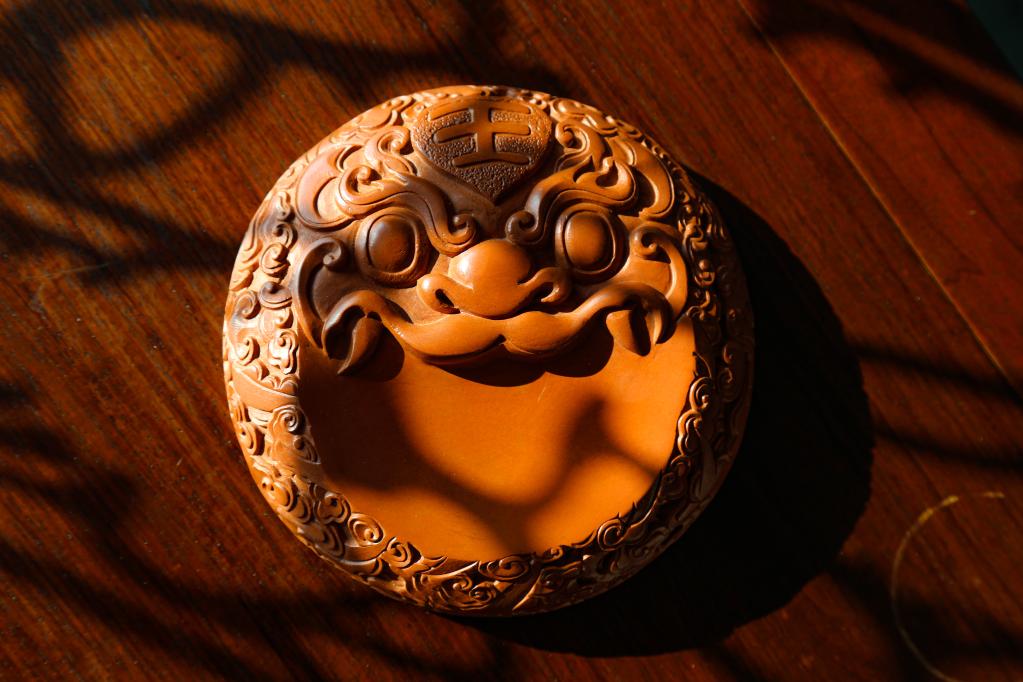 藺霄麟創(chuàng)作的虎虎生威硯,靈感來自民間虎頭帽,周圍雕刻如意祥云22朵,寓意2022年吉祥安康。(受訪者供圖)