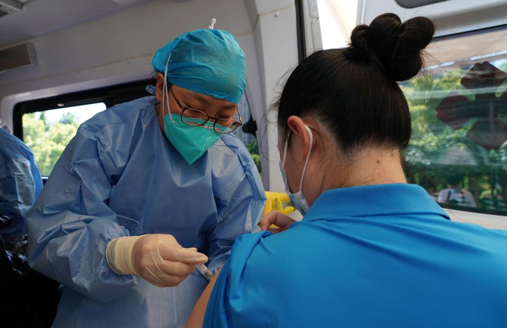 7月13日,在北京市海淀區(qū)北下關(guān)街道中國農(nóng)業(yè)科學(xué)院社區(qū)新冠疫苗臨時接種點,醫(yī)護(hù)人員在流動疫苗接種車上為社區(qū)居民接種。新華社記者 任超 攝