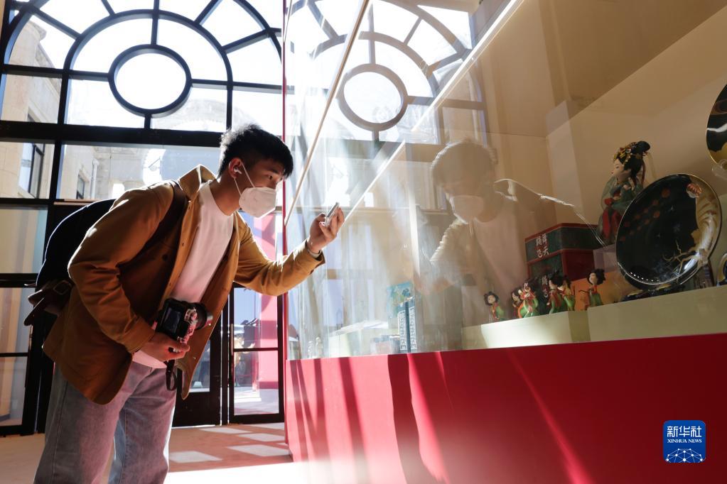 10月10日,觀眾在“奮進(jìn)新時代”主題成就展第五單元“堅定文化自信 建設(shè)社會主義文化強(qiáng)國”展廳拍攝展示代表性非遺作品和文創(chuàng)精品的博古架。新華社記者 張玉薇 攝