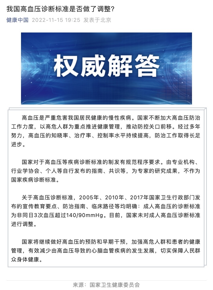 關(guān)于高血壓診斷標(biāo)準(zhǔn),2005年、2010年、2017年國(guó)家衛(wèi)生行政部門(mén)發(fā)布的宣傳教育要點(diǎn)、防治指南、臨床路徑等均明確:成人高血壓的診斷標(biāo)準(zhǔn)為非同日3次血壓超過(guò)140/90mmHg。目前,國(guó)家未對(duì)成人高血壓診斷標(biāo)準(zhǔn)進(jìn)行調(diào)整。