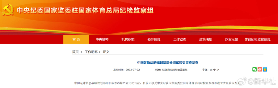 中國足球協(xié)會技術(shù)部部長譚海涉嫌嚴重違紀違法,目前正接受中央紀委國家監(jiān)委駐國家體育總局紀檢監(jiān)察組和湖北省監(jiān)委審查調(diào)查。中國足球協(xié)會戰(zhàn)略規(guī)劃部部長戚軍涉嫌嚴重違紀違法,目前正接受中央紀委國家監(jiān)委駐國家體育總局紀檢監(jiān)察組和湖北省監(jiān)委審查調(diào)查。(中央紀委國家監(jiān)委駐國家體育總局紀檢監(jiān)察組)