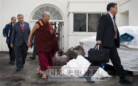2月18日,會見結(jié)束后,達賴興高采烈地告訴守候在白宮的美國媒體:“奧巴馬總統(tǒng)非常支持我!钡D(zhuǎn)身后,自恃為“貴賓”的達賴卻被“主人”從白宮后門請出。