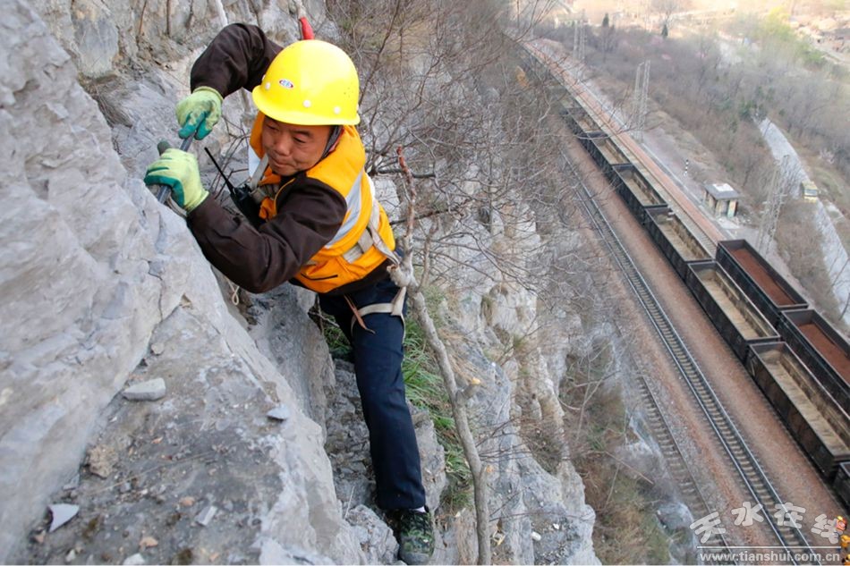 巍巍太行山,綿延八百里。太焦鐵路穿山而過(guò),蜿蜒在崇山峻嶺之中。在大山深處的月山工務(wù)段,鐵路依山傍溝,橋隧相連,山下溝壑縱橫。這里山體為石灰?guī)r結(jié)構(gòu),風(fēng)化后的石頭到雨季在雨水的沖刷下,極易掉落,給過(guò)往火車(chē)造成危險(xiǎn)。因此,這里勞作著一群特殊的工人——捅山工,負(fù)責(zé)清除一塊塊影響火車(chē)行駛安全的危石。