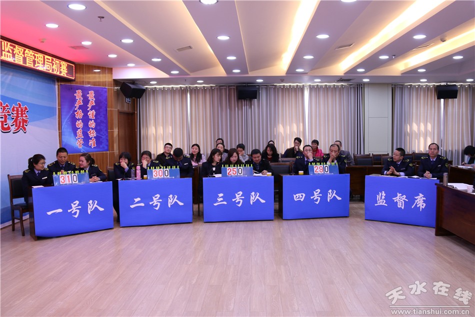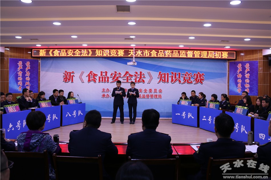 3月11日下午,天水市食藥監(jiān)局及直屬各單位在市局九樓會議室組織開展了《食品安全法》知識競賽初賽活動。局機關(guān)科室和直屬單位組成的8支參賽隊伍共24名監(jiān)管人員展開了激烈的角逐。知識競賽分為必答題、搶答題、風險題三個環(huán)節(jié)。隨著主持人宣布“開始”,選手們以飽滿的精神投入到了緊張激烈的競賽當中,經(jīng)過角逐,最后由市局食品生產(chǎn)監(jiān)管科和醫(yī)療器械監(jiān)管科組成的7號隊榮獲本次《食品安全法》知識競賽初賽第一名。市局機關(guān)及直屬各單位領(lǐng)導(dǎo)和全體干部職工80余人觀看了本次競賽。