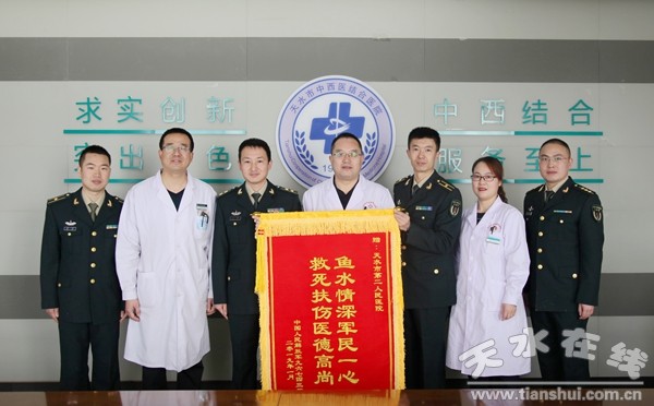 “綠色通道軍民一家,生命護(hù)航魚水情深”。這樸實無華卻滿含深情的十六個大字,是中國人民解放軍96743部隊贈給天水市中西醫(yī)結(jié)合醫(yī)院(市二院)錦旗上的題詞。這十六個大字,刻在市二院的錦旗上,鐫在市二院醫(yī)務(wù)人員的心田里。