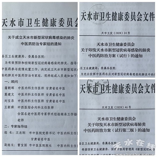 疫情防治中,中西醫(yī)結(jié)合形成醫(yī)治合力,是取得疫情防治效果的關(guān)鍵。醫(yī)院在第一時間選派省、市名老中醫(yī)和離退休專家加入全市中醫(yī)藥診療專家組,匯總歷代治療“溫病”“疫病”(新冠肺炎在中醫(yī)屬“溫病”)方案,積累診療經(jīng)驗,參考翻閱以往文獻(xiàn)資料,參照國家和甘肅省中醫(yī)藥防治方案,結(jié)合天水少濕熱而偏寒燥的地域氣候特點,先后制定出臺了2版全市中醫(yī)藥防治方案,為天水兩區(qū)五縣新冠肺炎防治提供了指導(dǎo)和參考,奠定了良好的防治基礎(chǔ)。專家組成員通過專家會診、遠(yuǎn)程會診等方式,為全市確診病例提供了中醫(yī)診治意見,確保中醫(yī)藥疫情防治早介入、早干預(yù)、早用藥、早治療,全程、全證型、全病例在遵循防治方案的原則上堅持一人一策、一人一方,精準(zhǔn)辯治、主動作為,是發(fā)揮疫情救治作用和提高臨床療效的有力措施。