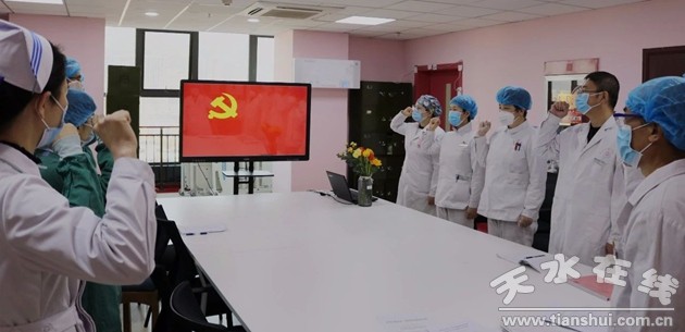 “我志愿加入中國共產(chǎn)黨,擁護(hù)黨的綱領(lǐng),遵守黨的章程……”,鏗鏘有力的入黨誓言在天水市第一人民醫(yī)院抗疫臨時(shí)黨支部響起,鮮艷的黨旗面前,所有黨員堅(jiān)定信念,構(gòu)筑了抵御疫情的嚴(yán)密防線。