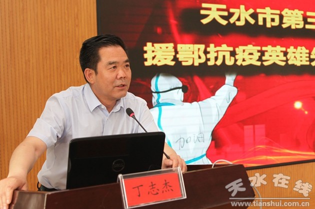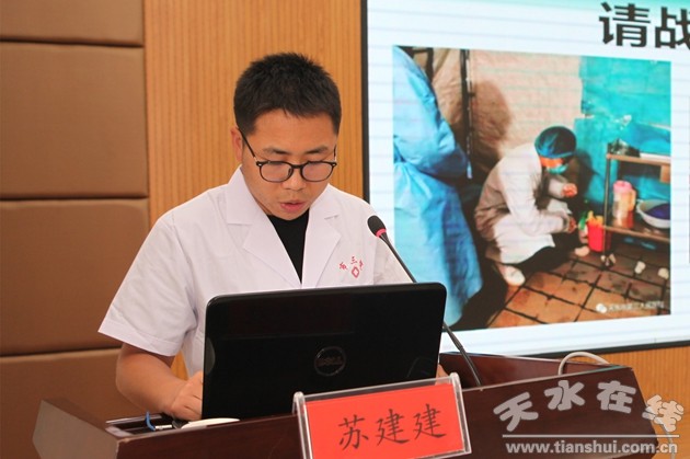 會上,天水市第三人民醫(yī)院援鄂抗疫英雄蘇建建作了先進事跡報告。他說“2020年2月16日,我作為甘肅省第四批援助湖北醫(yī)療隊的一員進駐武漢市優(yōu)撫醫(yī)院,即將廢棄的老住院樓,艱苦卓絕的生活和工作環(huán)境絲毫沒有影響到我奮戰(zhàn)的決心,反而讓我工作時更加謹慎仔細;進入病區(qū)前逐一檢查大家穿防護服、戴護目鏡、戴面屏等,細微到防護鏡必須蓋住防護帽上沿,密封性不好的地方要用透明膠粘起來;進入病區(qū)后戰(zhàn)友互相打氣,患者彼此暖心,雖然緊張疲憊,但患者一句‘白衣天使,謝謝您’,足以讓我重振旗鼓,起身奮戰(zhàn);經(jīng)常交流談心的93歲爺爺?shù)耐蝗浑x世,讓我?guī)锥冗煅,但我根本沒有時間難過,只能朝著爺爺去世的方向默默告別,接著繼續(xù)勇敢向前,避免這樣的悲劇再次上演。深深印在臉頰上的口罩勒痕,耳廓上緣的疼痛,被汗水浸透的衣服,疲憊卻又始終小跑的腳步,草草結(jié)束的一日三餐,成為我奮戰(zhàn)在武漢一線45個日日夜夜的工作常態(tài),但來自家人、戰(zhàn)友、領(lǐng)導(dǎo)、同事和同學(xué)無微不至的關(guān)懷支持便是我最堅強的后盾,病人渴望回歸正常生活的眼神便是我日夜堅守最強大的動力。從緊急進駐武漢醫(yī)院到最后匆匆離別,從陌路相逢到無話不談,從‘醫(yī)生’‘蘇醫(yī)生’到‘小蘇醫(yī)生’‘建建’,變化的是情緒和名稱,拉近的卻是心與心之間的距離……”
