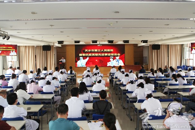 為弘揚榜樣力量,引導(dǎo)全院干部職工學(xué)習(xí)抗疫先進人物優(yōu)秀品質(zhì),進一步堅定全院干部職工理想信念,6月12日下午,天水市第三人民醫(yī)院黨委在門診十二樓多功能廳召開援鄂抗疫英雄先進事跡報告會。市三院領(lǐng)導(dǎo)班子成員、全院中層干部、全體黨員、職工代表共230余人參會。會議由黨委副書記、院長李剛主持。